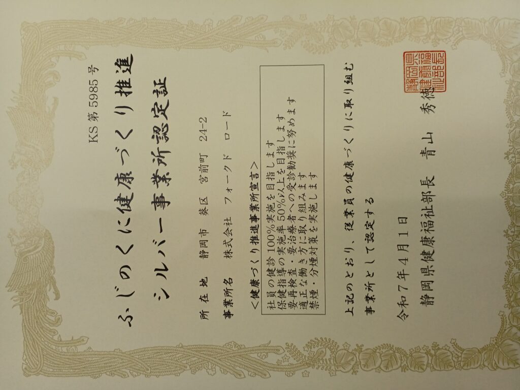投稿日: 2025.07.252025.07.04 投稿者: administrator株式会社フォークドロード「健康づくり推進事業所」 令和7年度健康づくり推進事業所宣言に基づき,地域の健康課題に即した取組や日本健康会議が進める健康増進の取組をもとに健康経営を実践している大企業や中小企業等の法人を顕彰する制度です。 今後も従業員様及び関係企業様などから「健康第一の理念を基に健康管理を経営的な視点で考え、戦略的に取り組む法人」として社会的に評価を受けることができる環境を整備することを目標としていきますので宜しく御願い致します。